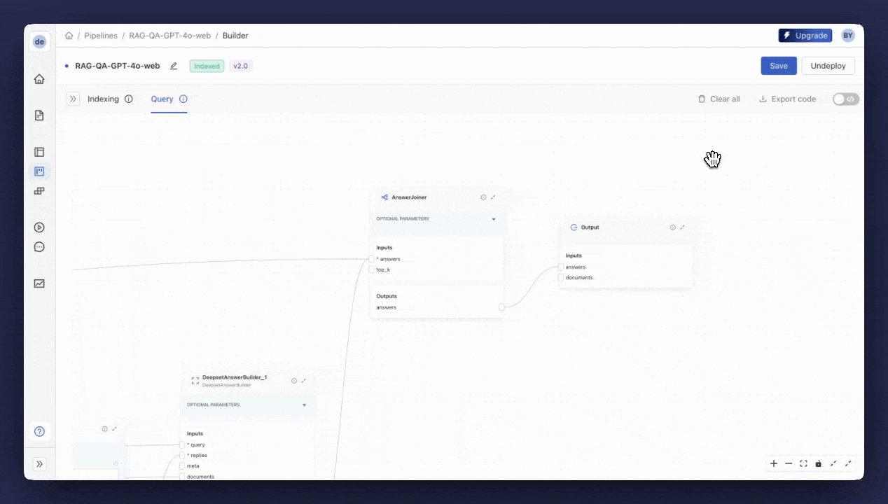 - 当您完成开发和测试后,您可以轻松地将管道导出为 Python 或 YAML 格式,以部署在您自己的基础设施中,或升级到 deepset Cloud,这是 deepset Studio 的企业版。
