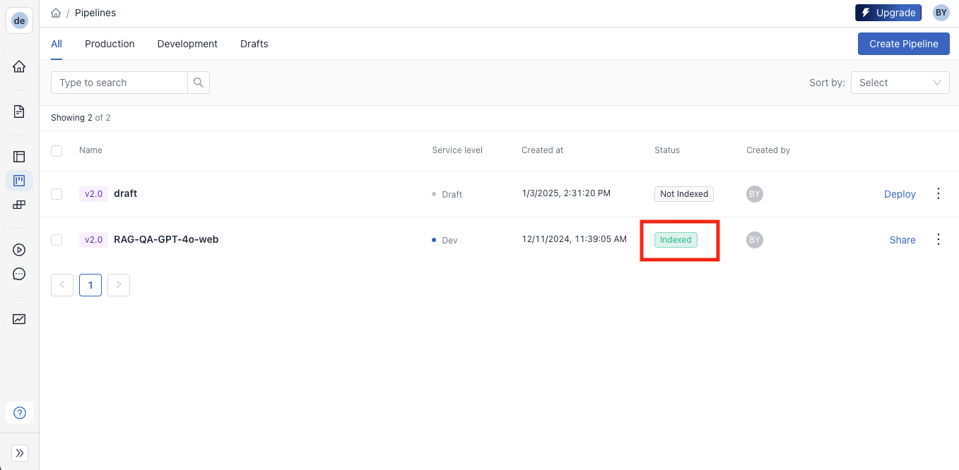 完成以上所有步骤后,部署管道。此过程可能需要一些时间,因为部署后,deepset Studio 会设置一个文档存储实例,处理所有文件,创建嵌入并对其进行索引。当一切完成后,您将在管道上看到Indexed标签。