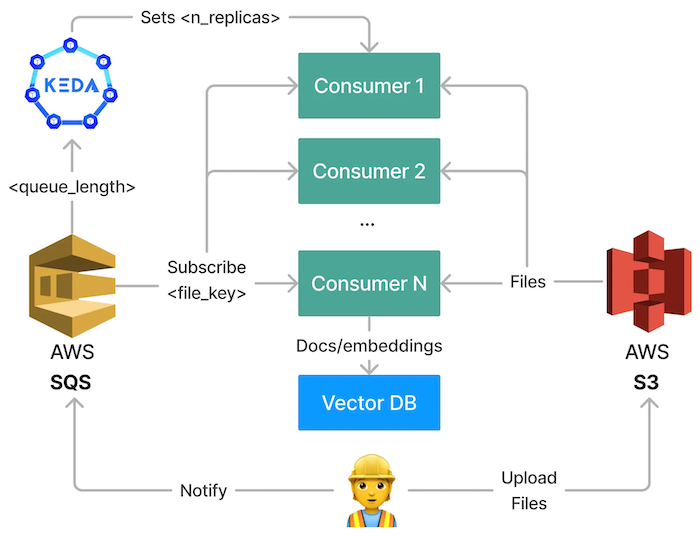 我们将使用用 Python 编写的无状态索引消费者,并学习如何使用 KEDA 在 Kubernetes 上进行自动扩展。这将实现吞吐量的水平扩展和延迟的按需启动。让我们深入了解架构设计!